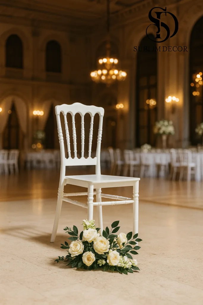 La chaise Napoléon blanche professionnelle est un incontournable du mobilier événementiel haut de gamme . Élégante, robuste et polyvalente, elle s'adapte parfaitement aux mariages , galas , réceptions , mairies , restaurants , salles de réception et lieux de culte , en intérieur comme en extérieur.