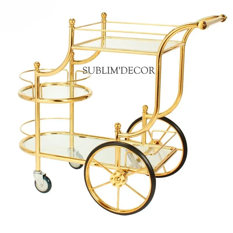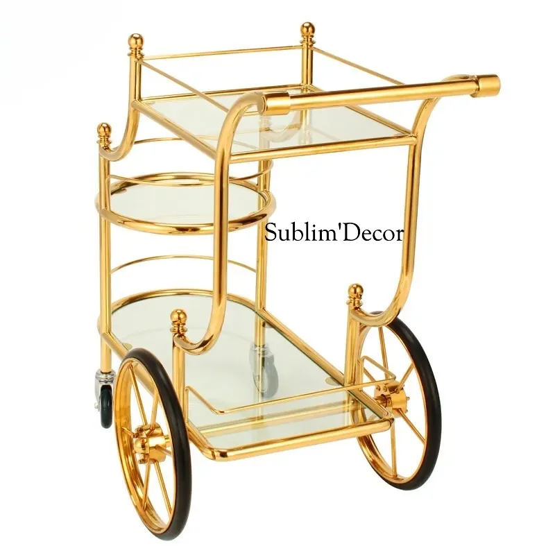 Ce chariot de service doré effet miroir Sublim’Decor allie design moderne et fonctionnalité professionnelle. Sa structure en métal / fer avec finition or et miroir apporte une touche élégante et raffinée aux réceptions, buffets et espaces de service lors d’événements haut de gamme.