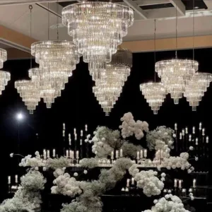 Pour un effet encore plus spectaculaire, associez ce lustre décoratif à des compositions florales suspendues, des panneaux LED ou des drapés élégants. Il devient ainsi un véritable point focal de votre décoration de mariage et de vos événements haut de gamme, contribuant à créer une atmosphère chic, chaleureuse et mémorable.