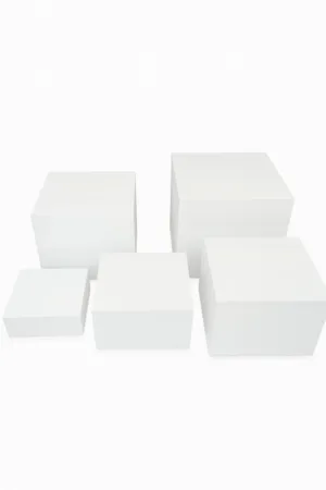 Composé de 5 cubes de tailles différentes (30×30×32 cm, 28×28×27 cm, 26×26×22 cm, 24×24×17 cm, 22×22×12 cm), cet ensemble permet une utilisation individuelle ou combinée pour créer des présentations dynamiques et harmonieuses. Idéal pour les buffets, tables de desserts, vitrines et présentations de produits.